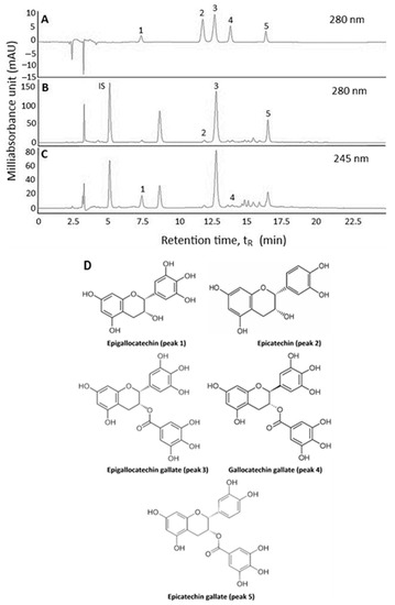HPLC chromatograms of catechin standards (A) and Oolong tea leaf waste extract (B,C) at detection wavelengths 280 nm (A,B) and 245 nm (C), as well as the structures of 5 catechins (D), epigallocatechin (peak 1), epicatechin (peak 2), epigallocatechin gallate (peak 3), gallocatechin gallate (peak 4) and epicatechin gallate (peak 5). IS, internal standard (L-tryptophan).