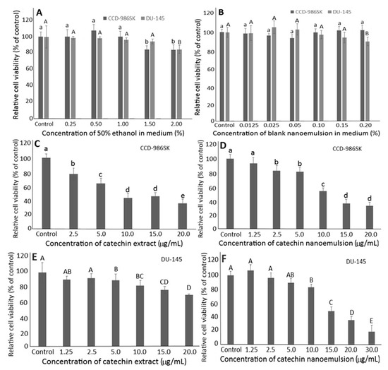 Effects of different concentrations of 50% ethanol (A) and catechin-free blank nanoemulsion (B) as well as catechin extract (C,E) and catechin nanoemulsion (D,F) on fibroblast cells CCD-986SK (C,D) and prostate cancer cells DU-145 (E,F) following incubation for 48 h. For control treatment, cells were incubated only in DMEM medium for CCD-986SK cells, and MEM medium for DU-145 cells. Data are shown as mean ± standard deviation of triplicate analyses (n = 3), with data bearing different small (a–e) and capital letters (A–E) to denote significantly different values at p < 0.05 for fibroblast cells CCD-986SK and prostate cancer cells DU-145, respectively.