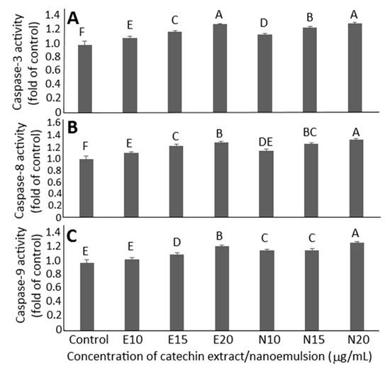 Effects of catechin extract and catechin nanoemulsion on caspase-3 (A), caspase-8 (B) and caspase-9 (C) activities of prostate cancer cell DU-145. For control treatment, cells were incubated only in MEM medium. E10, E15 and E20 are catechin extract treatments at 10, 15 and 20 μg/mL concentrations, respectively, while N10, N15 and N20 are catechin nanoemulsion treatments at the same concentrations. Data are shown as mean ± standard deviation of triplicate analyses (n = 3), with data bearing different capital letters (A–F) to denote significantly different values at p < 0.05.