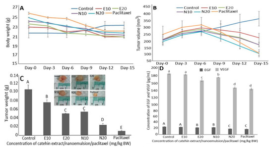 Effects of catechin extract, catechin nanoemulsion and paclitaxel on body weight (A), tumor volume (B) and tumor weight (C) as well as serum EGF and VEGF levels (D) of nude mice. E10 and E20 are catechin extract treatments at 10 and 20 mg/kg BW, respectively, with the same injection volume (0.2 mL), while N10 and N20 are catechin nanoemulsion treatments at the same dose. For paclitaxel treatment, an injection volume of 0.2 mL (10 mg/kg BW) was used. Data are shown as mean ± standard deviation of triplicate analyses (n = 3), with data bearing different capital letters (A–E) in Figure 5C,D and small letters (a–d) in Figure 5D to denote significantly different values at p < 0.05.