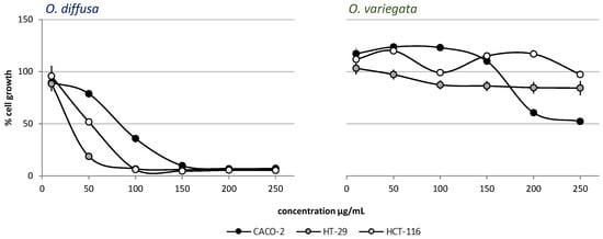 Antiproliferative activity evaluation of O. diffusa and O. variegata on the Caco-2, HT-29, and HCT-116 cell lines. Cell growth is expressed as percentage from control, and is plotted on the vertical axis, while doses of plant extracts are reported on the horizontal axis.