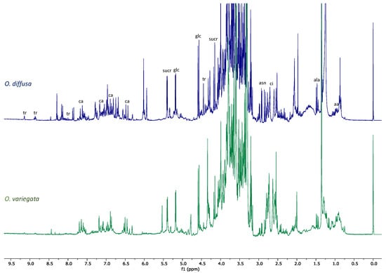 Stacked 1H-NMR spectra of O. variegata (green) and O. diffusa (blue). Spectra were acquired at 300 MHz, in 1:1 methanol-d4: buffer. Diagnostic signals of the main metabolites detected in both extracts are indicated on O. variegata spectrum by the following abbreviations: aa = amino acids, ala = alanine, asn = asparagine, ca = caffeic acid, ci = citric acid, glc = glucose, sucr = sucrose, tr = trigonelline.