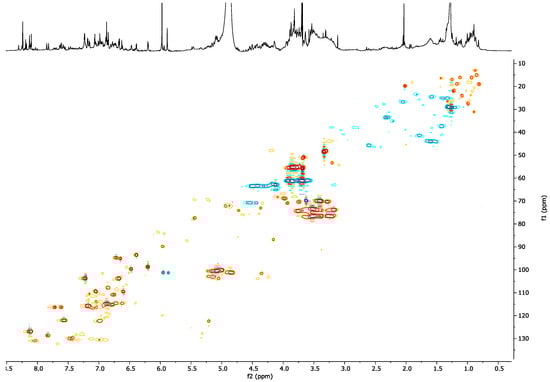 However, the spectrum was still rich in signals, especially in the aromatic region. The HSQC experiment (Figure 4) and the other 2D NMR experiments revealed several correlations. In particular, it was observed that the singlet proton at δH 8.14 was not bound to a carbon atom; this value was in good agreement with a hydrogen atom of an amidic functional group. This signal heterocorrelated, in the CIGAR-HMBC experiment (Figure S4), with a carbonyl carbon at δC 176.5. Furthermore, it also correlated, in the same experiment, with the quaternary carbon at δC 124.2, which was in turn correlated with two protons of a 1,2,4-tribubstituted aromatic system resonating at δH 6.90 (dd, J = 8.2; 2.0 Hz) and 6.97 (d, J = 2.0 Hz). The latter signal showed cross peaks with two oxygenated aromatic carbons at δC 147.8 and 146.1, both of which correlated with a third aromatic proton at δH 6.76 (d, J = 8.2 Hz) and with a singlet methylene at δH 5.87 (δC 101.2), indicating the presence of a 3,4-dioxymethylenephenyl group bound to the amide nitrogen. In addition, in the CIGAR experiment, the amidic proton correlated with a further aromatic carbon at δC 157.9, which in turn displayed cross-peaks with a proton at δH 8.01 (d, J = 9.0 Hz), as an indicator of a second 1,2,4-tribubstituted aromatic system. This proton correlated in the long-range experiment with the amide carbonyl and with a quaternary aromatic carbon at δC 118.8, which in turn correlated with other two aromatic protons resonating at δH 7.07 (d, J = 2.4 Hz) and 7.22 (dd, J = 9.0; 2.4 Hz), showing cross-peaks with an oxygenated aromatic carbon at δC 162.2. This carbon correlated with an anomeric proton at δH 4.98, therefore suggesting the presence of a sugar moiety, putatively identified, on the basis of an HSQC-TOCSY experiment, as glucose. These data were in agreement with the presence of a glucopyranosyl-2-hydroxy-N-(3,4-dioxymethylenephenyl)benzamide. However, the isolation and complete structural elucidation of this compound will be needed to confirm the hypothesized structure.