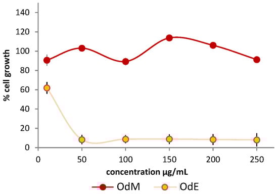 The OdM fraction was tested on HT-29 cells (Figure 5), but no activity was observed. Two possible explanations were then taken into consideration: (i) the occurrence of synergistic effects in the crude extract or (ii) the fact that the OdM fraction obtained from the amberlite chromatography, although enriched in several specialized metabolites, did not contain a significant amount of the active compounds. These active metabolites could be then found either in the water fraction obtained from the same chromatography, or in the ethyl acetate fraction (OdE) obtained in the previous step. By comparing the NMR profiles of the OdM and the crude extract (Figure 3 and Figure 4), it was clear that, besides the signals belonging to metabolites also detected in the crude extract of the inactive species O. variegata, there was also a significant decrease in the intensity of signals so far putatively attributed to oxylipins. These oxylipins could have been in the OdE fraction, which was therefore assayed. The ethyl acetate fraction showed activity on HT-29 cells (Figure 5).