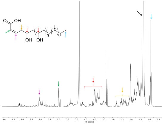 1H-NMR spectrum of the OdE fraction. A tentative general structure for the oxylipins is proposed, and diagnostic signals are indicated by colored arrows.