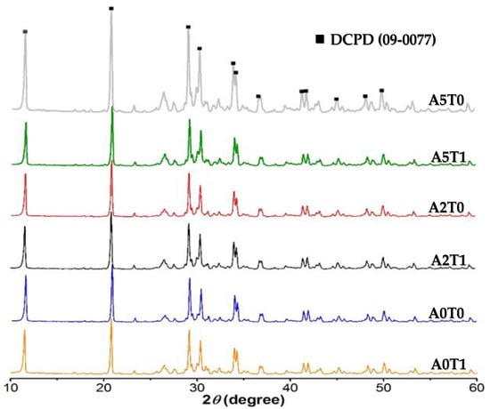 Figure 1 shows the XRD pattern of the cement samples A0T0, A0T1, A2T0, A2T1, A5T0 and A5T1 after 72 h of immersion in Ringer’s solution. The most significant peaks of the pattern were compared with the XRD pattern of DCPD, which is the expected product of the setting reaction of the cement, using the ICDD PDF 9-0077. A congruence in both position and intensity of the peaks for all samples were observed, which confirms the occurrence of the setting reaction and the precipitation of brushite crystals. It can be observed that the addition of sodium alginate and/or tetracycline do not affect the setting reaction of the cements.