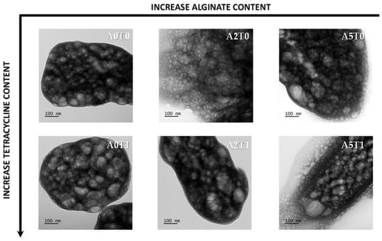 It is also observed that the samples with sodium alginate and without the presence of tetracycline in their formulations (A2T0 and A5T0) were the ones that reached the highest values. As expected, the addition of sodium alginate increases the mechanical properties of the material; this result corresponds with the effect reported in other studies [].