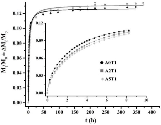 In the inset of Figure 4, it can be seen that the formulation A0T1 showed the highest release in that period of time due to the absence of sodium alginate in the sample, which causes a higher surface porosity and therefore facilitates the release of the drug. However, in the remaining days (full graphic, Figure 3) the other two formulations were the ones that were most released, since A0T1 had already expelled the highest amount of tetracycline in the first stages.