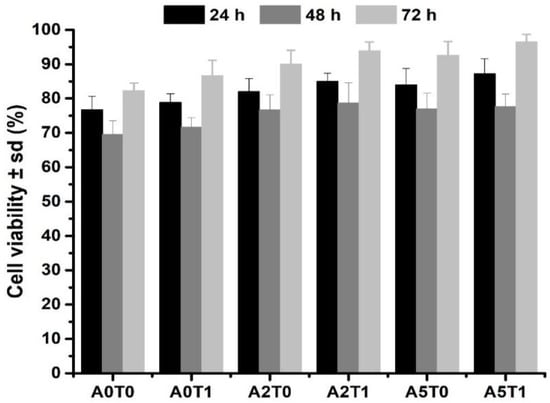 Figure 6 displays the cell viability percentages of the samples in the first 72 h of the initial setting. All samples show a percentage above 70, which means that the materials are not cytotoxic according to the standard ISO 10993-5. It also can be seen that the addition of sodium alginate and tetracycline improve the cell viability.