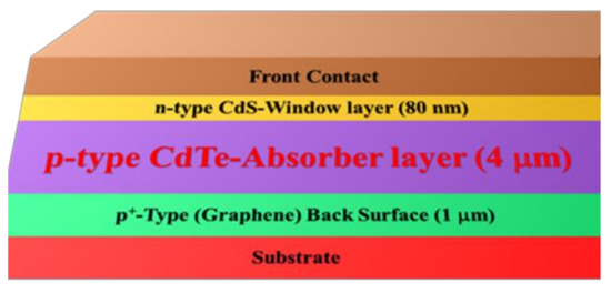 The purpose of numerical investigation in the PV cell analysis is to examine the validity of the projected device structure’s arranged cell geometry and cell efficiency. In this proposed model, p-type CdTe and n-type CdS were used as an absorber layer and window layer, respectively. An additional layer of highly doped graphene [35] was applied as a back surface field (BSF) layer next to the absorber layer on the substrate, as shown in Figure 1.