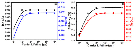Carrier lifetime in the BSF layer has a very vital role in the efficiency of a solar cell. The probability of carriers reaching their respective direction’s end before their recombination is higher when the carrier lifetime is longer [50]. The photovoltaic properties, like Isc, Voc, efficiency, and FF, were characterized in the range from 1 to 106 μs of carrier lifetime of the solar cells. When the carrier lifetime in the BSF layer increased from 1 to 103 μs, the PV properties of solar cells increased and, after that, these factors were saturated, increasing even further. The maximum values of Isc = 2.09 A, Voc = 0.809 V, η = 15% and FF = 88.54% were be observed at 1 × 103 μs of carrier lifetime, as shown in Figure 2a,b. Thus, the optimized value of carrier lifetime is 1 × 103 μs in the BSF layer of the CdTe solar cell.