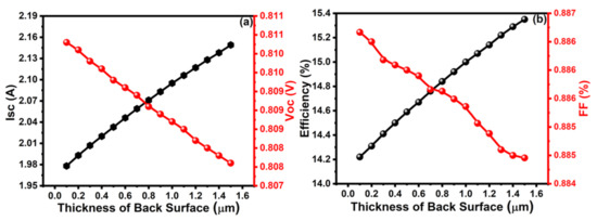 It is essential to control the optimal thickness of the BSF layer since an excessive thickness can cause fast degradation due to diffusion; however, a much thinner BSF layer gives insufficient intermixing and doping in the bulk CdTe [54]. The thickness of the BSF layer should be ultrathin, which is very difficult to control. The PV properties, such as Isc, Voc, η, and FF, were characterized in the range from 0.1 to 1.5 μm of the thickness of graphene as the BSF layer of the solar cell. The value of Isc increased with an increase in the thickness of the BSF layer, whereas the value of Voc decreased, as shown in Figure 4a. Similarly, the efficiency of a cell was increased with the increase in the thickness of the BSF layer, whereas the FF value was decreased, as shown in Figure 4b, so it is difficult to set the optimum thickness of the BSF layer. For efficient and practicable solar cell fabrication, an obtainable (i.e., possible) thickness of graphene as the BSF layer should be chosen. The optimum values of Isc = 2.09 A, Voc = 0.808 V, η = 15%, and FF = 88.53% were observed at 1 μm thickness of the BSF layer. Therefore, the optimum value of the thickness of graphene as the BSF layer might be 1 μm for fabrication.