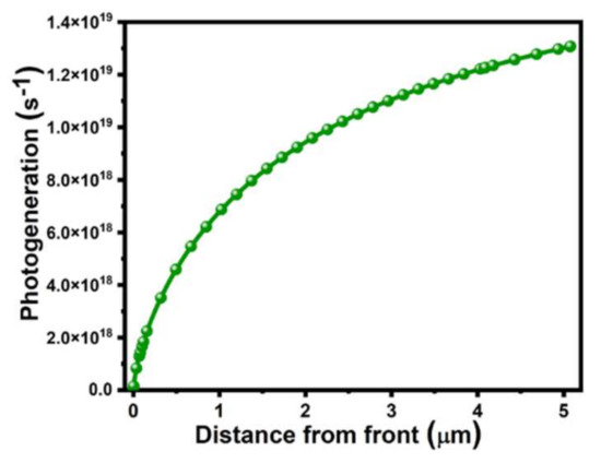 Minority carrier transport parameters critically affect the function and performance of various p-n junction semiconductor devices with bipolar transistors and solar cells [55]. Various recombination processes were applied to find the carrier lifetime and diffusion length of the minority charge carriers in the emitter and all parts of the solar cell [56]. The thickness of the p-n junction was about 4 μm and the photogeneration rate was 1.22 × 1019 s−1 at that thickness, which is appropriate for recombination of charge carriers. The simulation result showed that the photogeneration rate increases logarithmically as the distance from the front increases, as shown in Figure 5, which might be suitable for efficient solar cells.