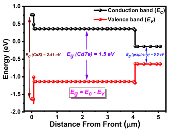 The energy bandgap is the threshold energy that is required to excite electrons up to a state in the conduction band where they can participate in conduction [57]. The theoretical values of the energy bandgap are 2.42 eV [58], 1.45 eV [59], and 0.264–0.786 eV [60] for window (CdS), absorber (CdTe), and BSF (graphene) layers, respectively, at room temperature. When light radiation with a wide range of wavelengths enters the solar cell, it must cross through different materials with various energy bandgaps. The simulated values of energy bandgaps were 2.41, 1.5, and 0.5 eV for window (CdS), absorber (CdTe), and BSF (graphene) layers, respectively, as shown in Figure 6, which almost match the theoretical values. From the simulation, it was confirmed that the proposed solar cell structure is appropriate for fabrication.