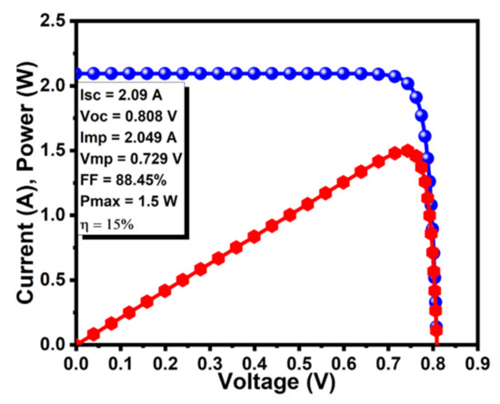 The ultimate characteristic is the current, power, and efficiency curve to examine the overall efficiency of the solar cell. The simulation results exhibited the highest values of Isc = 2.09 A, Voc = 0.808 V, Imp = 2.049 A, Vmp = 0.729 V, Pmax = 1.5 W, and η = 15%, as shown in Figure 7. Quantum efficiency is also one of the most important characteristics to estimate the performance of the solar cell in the specific range of the wavelength. The internal quantum efficiency (IQE) was above 100% whilst an external quantum efficiency of approximately 85% was achieved in the wavelength range of 300–1000 nm, as shown in Figure 8.