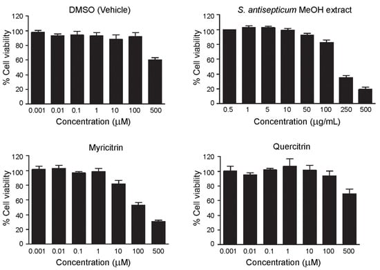 Cytotoxicity profiles of the extract from S. antisepticum and flavonoid glycosides 7 and 8; HEK-293 cells were treated with methanol (MeOH) extract (0.5–500 μg/mL), myricitrin (7) (0.001–500 μM), or quercitrin (8) (0.001–500 μM) for 36 h. Data are shown as the percentage of cell viability (mean ± SEM) (n = 4).
