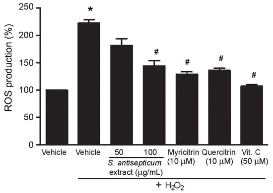 Cellular antioxidant effects of the methanol (MeOH) extract and flavonoid glycosides 7 and 8 from S. antisepticum; HEK-293 cells were treated with either methanol extract (50 and 100 μg/mL), myricitrin (7) (10 μM), quercitrin (8) (10 μM), or vitamin C (10 μM) for 3 h and then treated with H2O2 (100 μM) for 1 h. Data are shown as the percentage of ROS levels (mean ± SEM) as compared with that in control (vehicle; DMSO) group (n = 4). * p < 0.05 versus control; # p < 0.05 versus the H2O2 group.