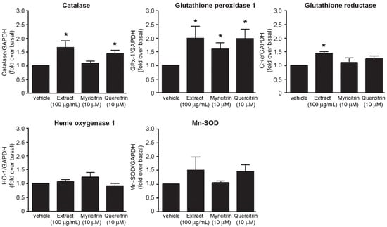 Effects of the methanol extract and flavonoid glycosides 7 and 8 from S. antisepticum on upregulation of antioxidant mRNA levels; HEK-293 cells were treated with either methanol extract of S. antisepticum (100 μg/mL), myricitrin (7) (10 μM), or quercitrin (8) (10 μM) for 6 h. The relative mRNA expression levels were quantified and shown as mean ± SEM as fold over basal (vehicle, DMSO) (n = 4). * p < 0.05 versus control.