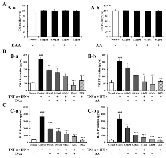2.2. DAA and AA Inhibited the Secretion of AD-Related Inflammatory Cytokines and Chemokines Increased by TNF-α and IFN-γ in HaCaT Cells