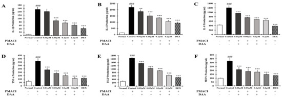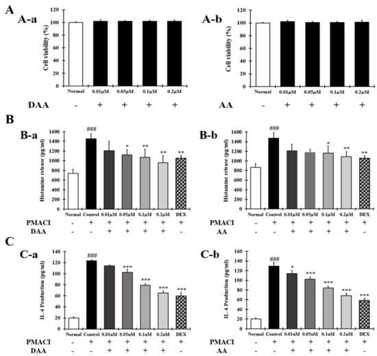 2.3. DAA and AA Inhibited the Secretion of AD-Related Inflammatory Cytokines and Chemokines Increased by PMACI in HMC-1 Cells