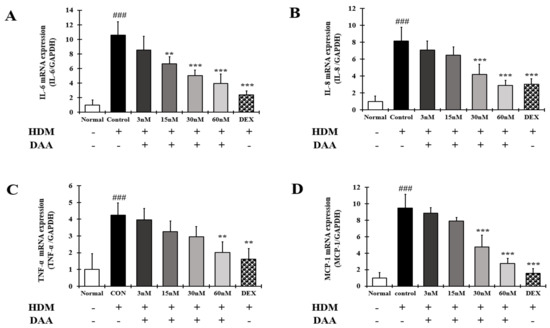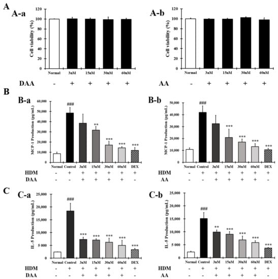 2.4. DAA and AA Inhibited the Secretion of AD-Related Inflammatory Cytokines and Chemokines Increased by House Dust Mite (HDM) in EOL-1 Cells