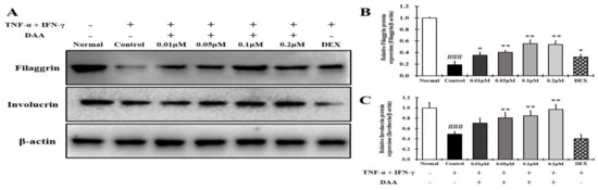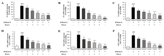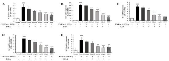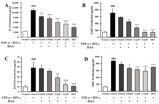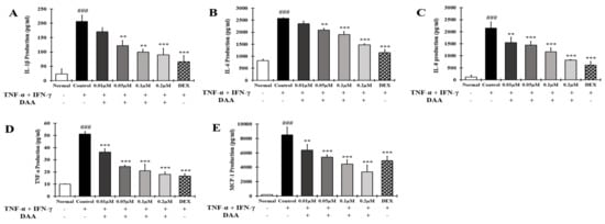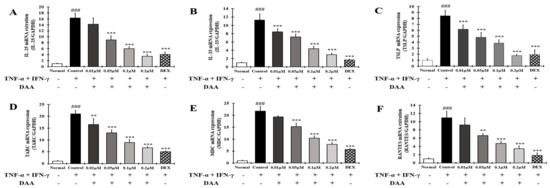2.6. DAA Inhibited the Gene Expression Levels of AD-Related Cytokines and Chemokines Increased by TNF-α and IFN-γ in HaCaT Cells