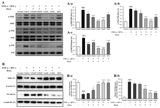 2.9. DAA Inhibited MAPK Phosphorylation and NF-κB Activation Increased by TNF-α and IFN-γ in HaCaT Cells
