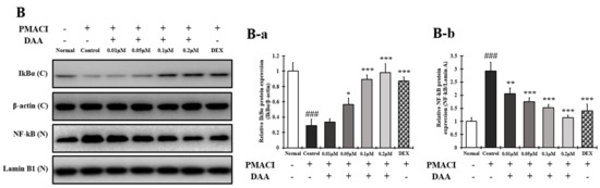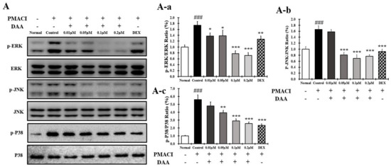 2.13. DAA Inhibited MAPK Phosphorylation and NF-κB Activation Increased by PMACI in HMC-1 Cells