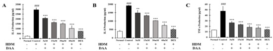 2.15. DAA Inhibited the Gene Expression of AD-Related Cytokines and Chemokines Increased by HDM in EOL-1 Cells