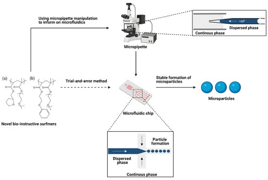 Particle formation with novel surfactants often requires lengthy optimisation if trial-and-error approaches are used. Using micropipette manipulation methods to inform droplet microfluidics removes this problem while providing detailed information about the system. The setup within the micropipette mirrors exactly that of the flow-focusing microfluidics chip so the information gained can be transferred directly. Polymeric surfactants used are (a) THFuA-co-mPEGMA and (b) EGPEA-co-mPEGMA in the dispersed phase with poly(d,l-lactic acid) (PDLLA) in ethyl acetate. The continuous phase is MilliQ water with, or without, poly(vinyl acetate-co-alcohol) (PVA). Figure created with BioRender.com.