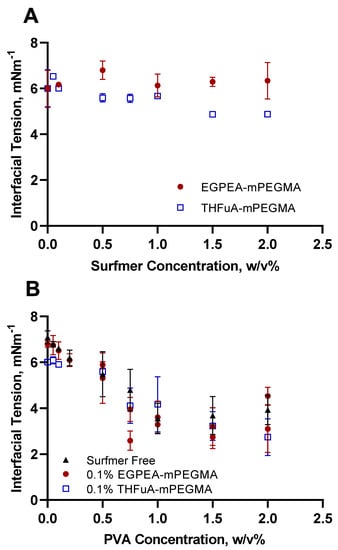 From Figure 2B, combining THFuA-co-mPEGMA with PVA, in the range where PVA ≤ 0.1% (w/v) provided a greater reduction in interfacial tension than either EGPEA-co-mPEGMA was used in combination with PVA ≤ 0.1% (w/v) or when PVA was adopted as a single-surfactant system. This observation was confirmed by applying a two-way ANOVA analysis to the data. The difference here is small, and for EGPEA-co-mPEGMA there is no significant change. However, the surfmers are required for their key role in providing the surface coverage of the bio-instructive chemistry.