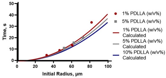 Particles were shown to be slightly agglomerated, which is due to the collection method. In order to prevent aggregation of particles during collection, sufficient time must be allowed for the solvent to be removed. Single-particle studies were conducted using the micropipette to record the time taken for solvent removal to be completed from different sized droplets, defined as the particles reaching a constant size. This was performed for drops with a 30 to 80 µm initial radius and for PDLLA concentrations of 1%, 5% and 10% (w/v) in ethyl acetate. Representative times for the drops to achieve constant size are shown in Figure 4 as individual points and are compared to the theoretical time calculated.