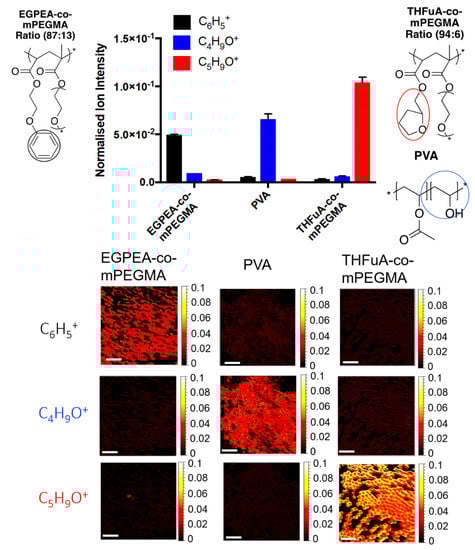 ToF-SIMS data showing intensities and chemical map images of three key ions associated to three surfactant structures (C6H5+–EGPEA-co-mPEGMA, C4H9O+–PVA and C5H9O+–THFuA-co-mPEGMA) where ions from the structures are circled in black, blue and red, respectively. Molar ratios of surfmers (hit material:mPEGMA) that have been included in the formulations were EGPEA-co-mPEGMA (87:13) and THFuA-co-mPEGMA (94:6). Particles containing surfmer were prepared using a dispersed phase containing 5% w/v PDLLA in ethyl acetate and a 0.1% w/v surfmer concentration. Emulsions were formed in a 0.1% w/v PVA concentration. Particles prepared without surfmer were prepared using a dispersed phase containing 5% w/v PDLLA in ethyl acetate. Emulsions were formed in a 2% w/v PVA concentration. Ion intensities have been normalised against total ion intensity. Error bars equal ± 1 SD unit, n = 3. Chemical map images are shown from a normalised intensity of 0 (black) to a normalised intensity of 0.1 (white). Scale bars on chemical images represent 100 µm.