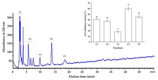 RP-HPLC profiles of fraction C and ACE inhibition activity of each subfraction. Different lowercase letters (a–c) above the bars indicate significant differences (p < 0.05).