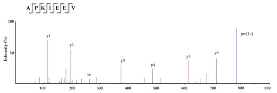 ESI-MS/MS spectrum of APKIEEV identified in areca nut kernel globulin hydrolysates.