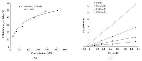 3.4. ACE Inhibitory Activity and Inhibition Kinetics