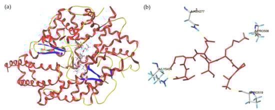 The simulated combination pattern between peptide APKIEEV and ACE was shown in Figure 5a, and the best-ranked docking pose of APKIEEV binding with ACE was shown in Figure 5b. A previous study showed that ACE has three main active site pockets (S1, S2 and S1′). The S1 pocket includes Ala354, Glu384 and Tyr523 residues and the S2 pocket includes Gln281, His353, Lys511, His513 and Tyr520 residues, while the S1′ contains Glu162 residue [18]. APKIEEV can bind to four active sites of ACE including ASN277, LYS454, PRO508 and PRO519 which do not all belong to the key active sites (sites S1, S1′ and S2) of ACE. Therefore, APKIEEV inhibits ACE activity with a complex modality of uncompetitive and noncompetitive inhibition [21], which is consistent with the results as shown in Figure 4B. As shown in Table 2, there are four short hydrogen bonds through which APKIEEV can bind to ACE. The T-score is one of the key indicators to evaluate the docking capability of ligand and ACE, and the required thrust value of T-score is 6.0 [20]. The T-score of APKIEEV is 11.33 (Table 2), suggesting that the combination between APKIEEV and ACE is strong [9]. This is also the main reason why APKIEEV has relatively high ACE-inhibitory activity (550.41 μmol/L, Figure 4A). It has been demonstrated that uncompetitive inhibitors usually showed lower ACE-inhibitory activity than that of competitive inhibitors [16]. Therefore, APKIEEV (an uncompetitive inhibitor) showed a lower ACE inhibition activity than that of peptide NMAINPSKENLCSTFCK (a competitive inhibitor of ACE) [18].