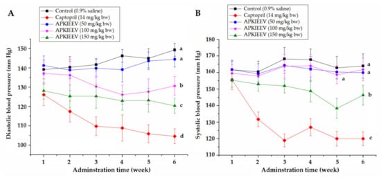 Effects of oral administration of individual peptide APKIEEV on systolic blood pressure (A) and diastolic blood pressure (B) of spontaneously hypertensive rats (SHRs). SHRs in the low-, middle- and high-dose group were orally administered the peptide at 50, 100 and 150 mg/kg/bodyweight once daily, respectively. SHRs of the positive control group were given captopril at 14 mg/kg/body weight once daily, whereas the SHRs in control group were just given physiological saline (0.5 mL). Different lowercase letters (a–d) near the lines mean significant difference (p < 0.05).