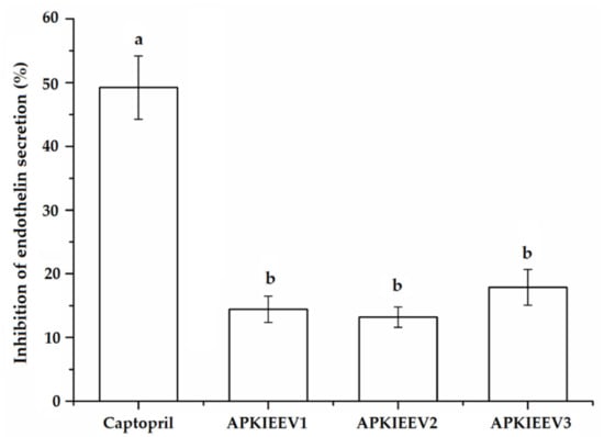 Effect of peptide APKIEEV on endothelin-1 secretion with Captopril (1 mg/mL) as positive control. APKIEEV1: APKIEEV at concentration of 0.5 mg/mL; APKIEEV2: APKIEEV at concentration of 1.0 mg/mL; APKIEEV3: APKIEEV at concentration of 1.5 mg/mL. Different lowercase letters on the bars (a–b) mean significant difference (p < 0.05).