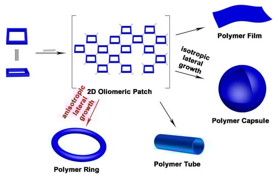 Recent studies have shown that the polymerization of rigid, flat-shaped building blocks with multiple symmetrical polymerizable groups and linear linkers with double polymerizable groups can lead to a variety of well-defined nano/microstructures, rather than irregular polymers without template-assisted preorganization. In addition, the shape, size, properties and function of these nano/microstructured materials can be controlled through the rigorous and precise selection of parameters that include building blocks, linear linkers and reaction media. These building blocks first grow in polymerization into 2D oligomeric patches without the addition of preorganization or templates. Subsequently, further growth of 2D oligomeric patches to drive the system with or without curvature production forms polymer capsules, polymer films, polymer tubes and polymer rings. This review demonstrates the recent discoveries and advances in template-free self-assembly of structurally defined nano/micromaterials formed by 2D polymers (Figure 1).