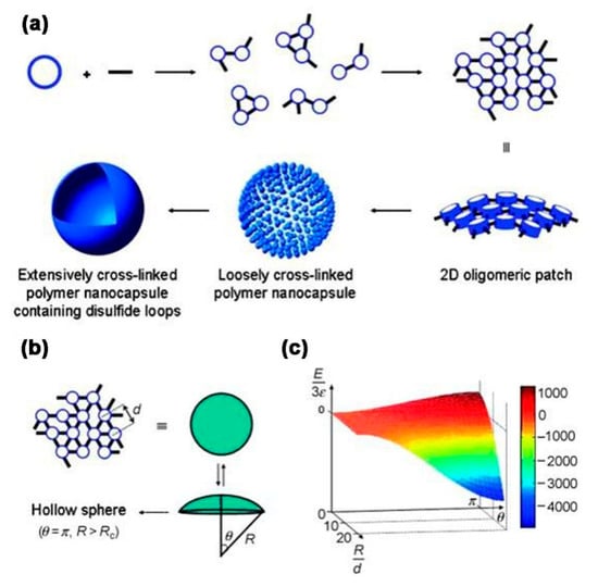 (a) The proposed mechanism of the formation of the polymer capsules; (b,c) theoretical model and energy profile of the capsule formation process. Reprinted with permission [25] Copyright 2007 Wiley-VCH.