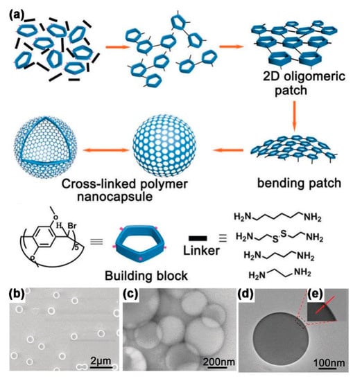 The first discovery for the preparation of polymer nanocapsules based on template-free self-assembled strategy that used supramolecular macrocyclic host molecules as building blocks was reported by Kim and co-workers in 2007 [25]. A monolayer thick polymer nanocapsule of a stable structure, narrow size distribution and regular morphology with a diameter of 110 nm and a wall thickness of 2.1 nm was successfully constructed by ultraviolet (UV) chemical polymerization by using cucurbit [6]uril (CB [6]) derivative (allyloxyCB [6]) as the building block and dithiol (3,6-dioxa-1,8-octanedi-thiol) as the linker. The mechanism of formation of nanocapsules is as follows (Figure 2): (1) The building blocks and the linkers were initially polymerized laterally to form a 2D oligomeric lamellar structure. (2) As the reaction continued, the oligomers continued to grow by lateral cross-linking, forming larger lamellar structures. When the lamellar structure reached a certain level of dimensional growth, it ceased to grow in a planar direction, and began to curl in order to reduce the stresses due to both solvent effects and thermodynamic effects. The curled lamellar structures could continue to react, resulting in a thermodynamically stable spherical product such as a loose capsule. (3) The unreacted reactive groups in the shell of the loose capsule were further cross-linked with the linker, which ultimately formed a well-matured, highly cross-linked and robust polymer nanocapsule. Theoretical calculations showed that the formation of capsules was mainly determined by the self-energy of the polymers in the reaction process, since the principle of minimum energy drove the curling of the lamellar structure into the capsule structure. In order to adequately test this mechanistic hypothesis, it was discovered that, by changing the solvent for assembly, the length of the linker, the capsule size could be controlled [26]. In addition to cucurbit [n]uril (CB [n]), pillar [n] arene (P [n] A) is a new type of macrocyclic host molecule with excellent host–guest chemistry properties. Liu and co-workers reported the first facile synthesis of laterally modified pillar [5] arene (P [5] A) derivative (bromoP [5] A) by methylene-bridged bromination reaction of P [5] A, which was used as a novel building block for the preparation of template-free, self-assembled polymer nanocapsules by the polymerization with diamines (Figure 3) [27,28,29]. Scanning electron microscopy (SEM) results showed that after polymerization, a large amount of spherical structures of uniform size and structure were produced, with the sizes between 300 and 500 nm. Transmission electron microscopy (TEM) results showed these spherical structures with a hollow structure inside, indicating the formation of highly ordered hollow capsules. High resolution TEM results also showed that the wall thickness of these hollow capsules was particularly thin, with a thickness of 1.2 nm. The results of the control experiments showed that the length of the cross-linker has a great influence on the formation of capsules, for which only an alkyl diamine of the suitable length should be selected. The longer the length of the cross-linker, the larger the size of the capsule formed. The polymer capsules were dispersible, uniform in shape, homogeneous and dimensionally controllable with an interior that can be well coated with cargos. The capsule surface can also be modified with functional groups by covalent and non-covalent approaches, providing the basis for the development of highly efficient smart materials.