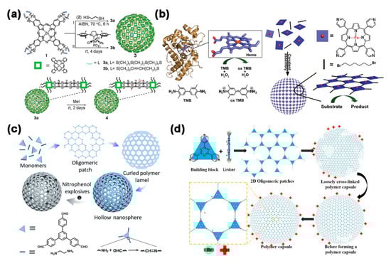 Schematic representation. (a) Direct synthesis of Pc polymer capsules. Reprinted with permission [38] Copyright 2013 Royal Society of Chemistry; (b) The active site of HRP and the synthesis of polymer capsules with peroxidase-like activity. Reprinted with permission [42] Copyright 2018 Royal Society of Chemistry; (c) The formation of the polymer capsules with positive charge. Reprinted with permission [49] Copyright 2020 Elsevier; (d) The formation of the AIE polymer capsules and the application in the detection of nitrophenol explosives. Reprinted with permission [46] Copyright 2020 Science China Press and Springer Nature.