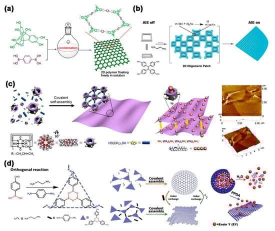 - Baek, K.; Yun, G.; Kim, Y.; Kim, D.; Hota, R.; Hwang, I.; Xu, D.; Ko, Y.H.; Gu, G.H.; Suh, J.H.; et al. Free-Standing, Single-Monomer-Thick Two-Dimensional Polymers through Covalent Self-Assembly in Solution. J. Am. Chem. Soc. 2013, 135, 6523–6528. [Google Scholar] [CrossRef]