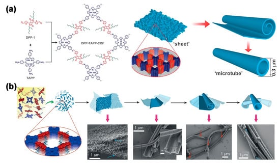In 2018, Beuerle and co-workers reported the first evidence for self-assembly of “bottom-up” microtubes based on covalent organic frameworks (COFs) that were obtained by the synthesis of the tetraphenylporphyrin (TPP) building blocks and the diketopyrrolopyrrole (DPP) linkers (Figure 6a,b) [55]. The available COF spontaneously aggregated into hollow microtubular assemblies with an outer diameter of approximately 300 nm and an inner diameter of around 90 nm. The mechanistic study showed a temporal dependence of the transition from initial 2D lamellar structures to tubular microstructures. It was proposed that automatic rolling into a tubular structure minimized unstable interactions of the solvent molecules. These discoveries pave the way for inventive future experiments with attractive single microtubules, including appropriate guest molecules as possible or even larger nano/microscale structures.