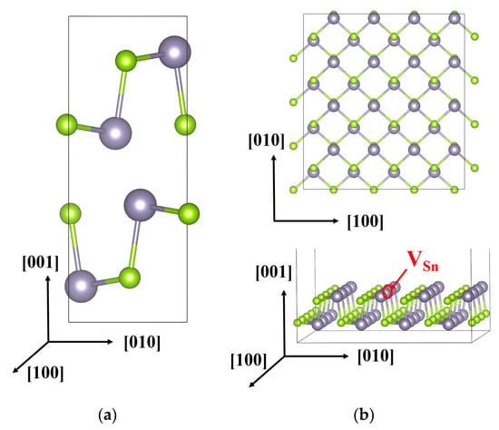 Density functional theory (DFT) computations were performed using the plane-wave basis set in the VASP with the projector augment wave (PAW) method [28,29]. Exchange and correlation effects for the structural relaxation were approximated by generalized gradient approximation (GGA) utilizing the Perdew–Burke–Ernzerhof (PBE) functional [30,31]. The Grimme custom method for DFT-D3 correction was employed to precisely depict the impacts of van der Waals interactions [32,33]. The HSE06 (Heyd–Scuseria–Ernzerhof) functional was utilized for electronic structure computations because the PBE functional typically underestimates the bandgap value [28]. The cutoff energy was set to be 500 eV for the plane-wave basis set. The Brillouin zone (BZ) was sampled using a 8 × 7 × 3 k-point Monkhorst–Pack sampling grid for the bulk SnSe and a 2 × 2 × 1 grid for the SnSe monolayer. The convergence criteria of energy and force were 1 × 10−5 eV and 0.01 eV/Å, respectively. A vacuum layer of 15 Å was added along the c-axis of the SnSe monolayer to avoid the impact of the periodic layer.