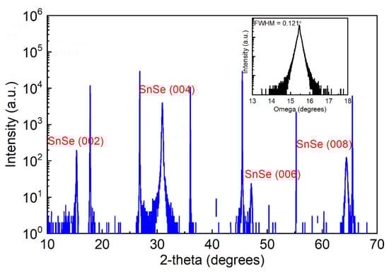 Being a 2D layered material, high-quality SnSe layers can be obtained on mica substrates, which also belong to the class of 2D materials providing a chemically inert, atomically flat, and electrically insulating surface [26]. As shown in Figure 2, only the diffraction peaks at 15.3°, 30.9°, 47.1°, and 64.4° originating from the SnSe (002) family planes emerge in the XRD pattern, suggesting a highly textured growth along its c-axis, namely perfect layer-by-layer stacking. In addition, an in-plane phi scan of the SnSe (016) plane with respect to the SnSe (001) plane was conducted by tilting the sample at an angle of χ = 24.71° and setting the incident x-ray angle of 2θ = 52.17° as shown in Figure S1 in the Supplementary Materials. As a result, the lattice constants of SnSe can be derived to be a = 4.42 Å, b = 4.19 Å, c = 11.57 Å. The XRD pattern and the calculated crystal parameters are in excellent agreement with the JCPDS database (No. 1089–0236). The inset in Figure 2 describes the XRD rocking curve carried out on the SnSe (004) plane with respect to a mica substrate. The narrow peak demonstrates an FWHM as small as 0.121°, which might be the narrowest value ever reported and indicates excellent quality of SnSe crystallinity [26,27].