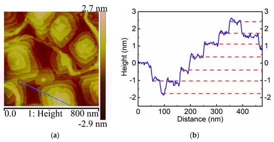 The AFM morphology is displayed in Figure 3. The root-mean-square (RMS) roughness was calculated to be 1.03 nm (on a two-micron scale), indicating a very flat SnSe (001) surface. Orthorhombic terrace-like features emerged with the size of ~500 nm and a height of 0.68 nm on the average, signifying the monolayer thickness, which is consistent with the value obtained from the XRD data in Figure 2.