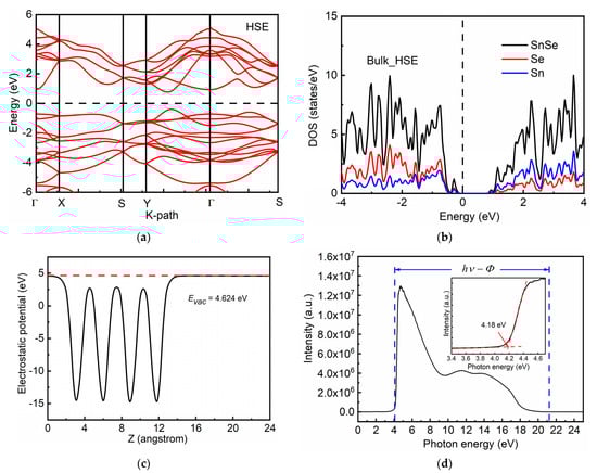 where Φ is the electronic work function, Evac is the energy of the vacuum level, and EF is the energy of the Fermi level. Through calculations, it was found that the energy of the vacuum level was 4.624 eV and the Fermi level was located 0.4563 eV above the valence band maximum. The average electrostatic potential is presented in Figure 4c. The work function of the SnSe (001) surface was thus calculated to be 4.1677 eV, which agrees well with the value of 4.18 eV derived from the UPS measurement as shown in Figure 4d.