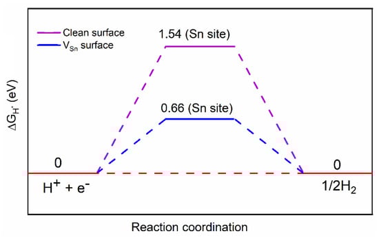 HER activity was evaluated by plotting a two-state HER free energy diagram [31], which contains the initial H+ + e– state, the intermediate adsorbed H* and the final ½H2 product. It is well-known that an optimum HER site has a free energy change of hydrogen adsorption close to zero [34,35]. The HER performance of the SnSe monolayer is summarized in Figure 5. It is clearly observed that the clean basal surface of the SnSe monolayer possesses a ΔGH* value of 1.54 eV, demonstrating relatively poor HER activity. However, when an Sn defect site was introduced, it was obviously found that substantially decreased to 0.66 eV, namely by a factor of 2.3, indicating that the HER performance of SnSe can be greatly boosted by introduction of Sn vacancies acting as reactive sites.